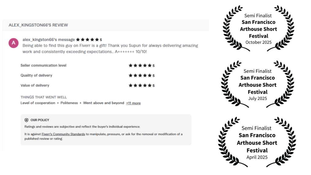 When I first connected with Alex, he shared how frustrated he was after working with several music video editors who could not deliver the quality he was paying for. Communication barriers, lack of creative care, and uninspired visuals had slowed his artistic journey. Through a shared passion for meaningful storytelling and cinematic music video production, we began collaborating closely. Since then, we have created dozens of emotionally driven music videos together, many of which have been nominated for international film festivals. By understanding his vision and removing the creative roadblocks in his path, I was able to support his growth as an independent artist — helping his music reach global audiences through powerful visual storytelling.